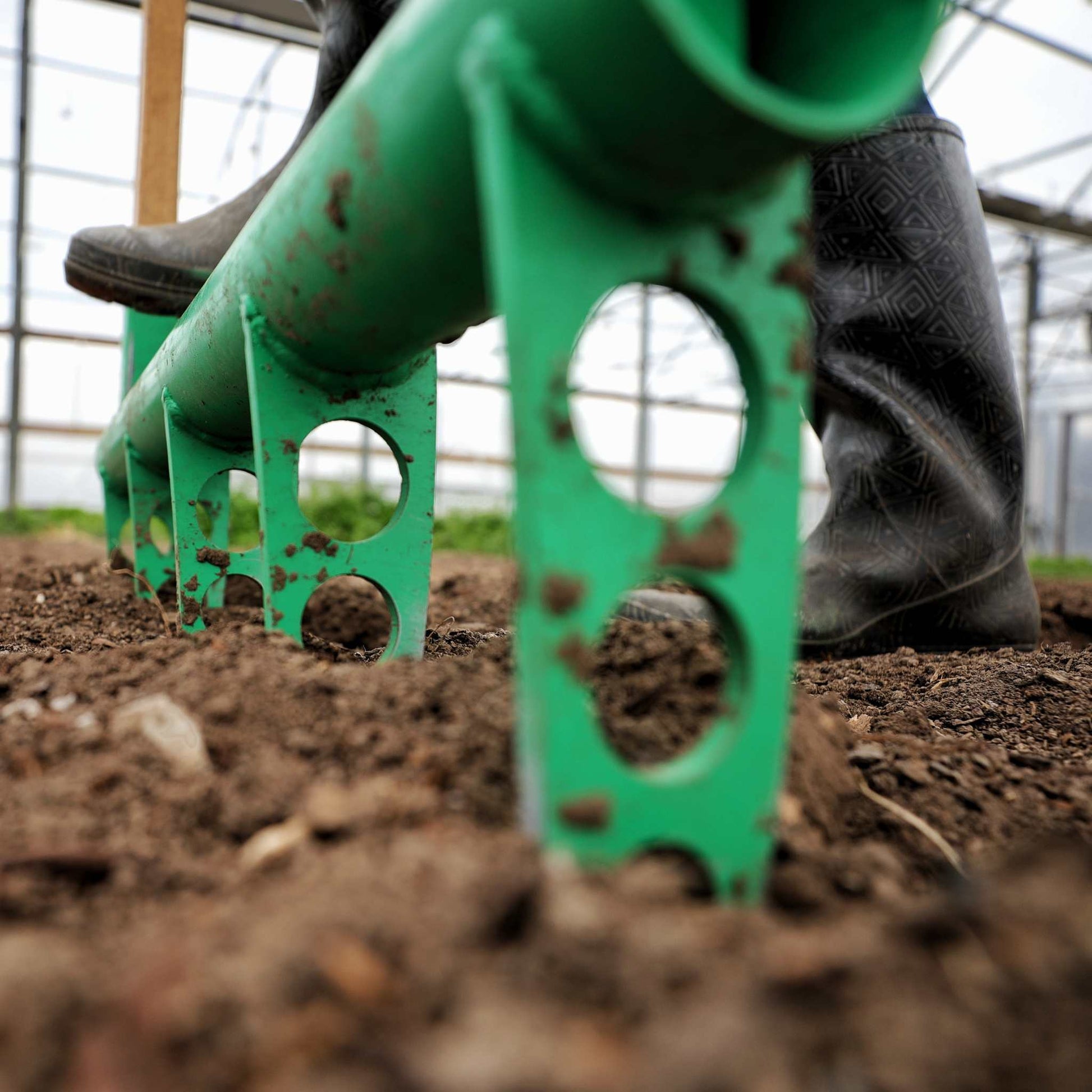 Simply insert the tines into the soil at the end of your bed and step down on the crossbar, using body weight to insert deeply. Rock gently and pull back on the handles to aerate the soil without overturning it. After a 45° handle tilt, remove the tines and move to the next section. For new soil, a second pass might be necessary to fully establish aeration channels. For more information check out How to Use a Broadfork: Techniques for Healthier Soil and Stronger Plants
